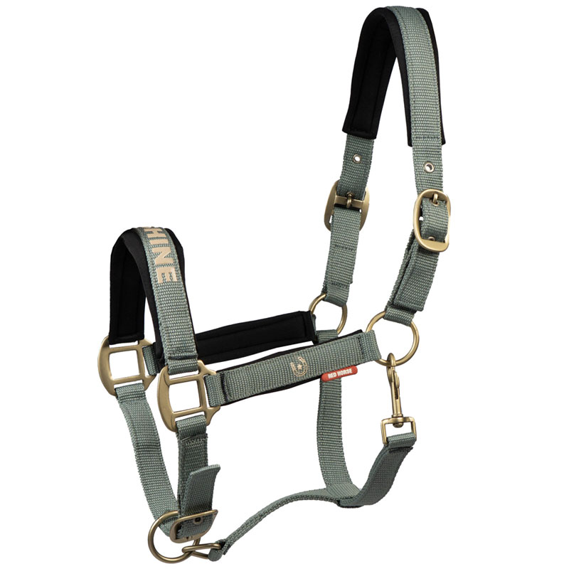 Red Horse Halsterset Kyo Hunter Green. Halster compleet met bijpassend touw voorzien van zachte neopreen voering onder het kopstuk, onder de neusriem en onder de bakstukken. Het halster heeft een dubbel verstelbaar kopstuk, een verstelbare neusriem en is afgewerkt met Ride & Shine tekst op de neusriem.