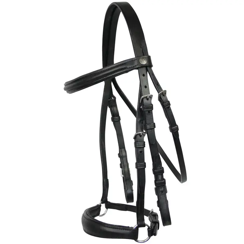 Hoofdstel van het merk Rider Pro met hannoveraanse africhtingsneusriem. Het hoofdstel is uitgevoerd met een leder gevoerde neus- en frontriem. Het hoofdstel wordt geleverd inclusief webband teugels met hand stops en gesp sluitingen.