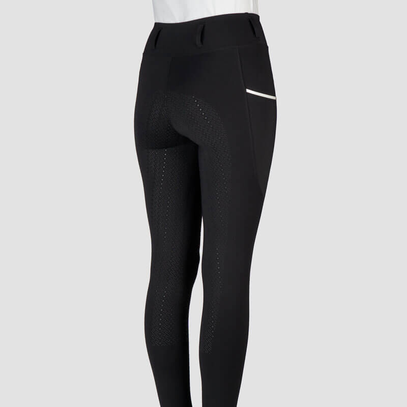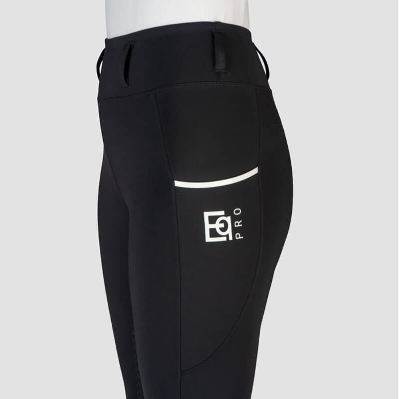 Deze kinder rijlegging is uitgevoerd met een aansluitende tailleband in combinatie met riemlussen. De legging heeft zakken op beide benen onder andere geschikt voor de mobiele telefoon en is uitgevoerd met een Full Grip zitvlak wat zorgt draagt voor een stabiele zit in het zadel. De legging is afgewerkt met glitter piping langs de zakken en EQPRO logo op het linker been.