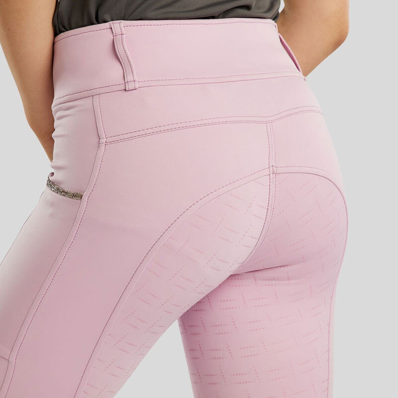 Rijlegging Montar MoLila Crystal Junior Candy Pink. Modieuze en comfortabele kinder rijlegging afgewerkt met Montar logo op het rechter been vervaardigd uit champagne kleurige crystal steentjes en crystallen bies langs beide zakken.
