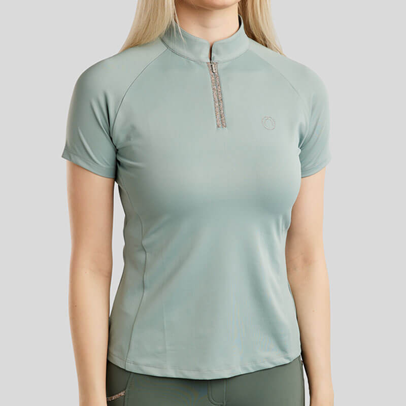 Shirt Montar MoLila Crystal Junior Turin. Paardrijshirt voor kinderen met korte mouwen en een opstaand boordje in combinatie met een korte ritssluiting.