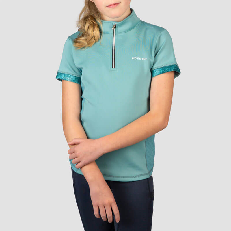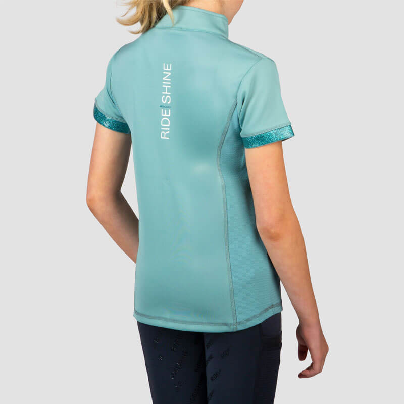 Shirt Red Horse Miki Kids Eucalyptus Green. Kinder paardrijshirt gemaakt uit sneldrogende en ademende stof met mesh inzetstukken aan beide zijde en een opstaand boordje met ritssluiting. Het shirt is afgewerkt met glans en glitter details.