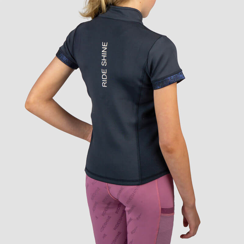 Shirt Red Horse Miki Kids Navy Blue. Kinder paardrijshirt gemaakt uit sneldrogende en ademende stof met mesh inzetstukken aan beide zijde en een opstaand boordje met ritssluiting. Het shirt is afgewerkt met glans en glitter details.
