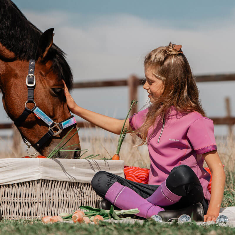 Shirt Red Horse Miki Kids Thistle Purple. Kinder paardrijshirt gemaakt uit sneldrogende en ademende stof met mesh inzetstukken aan beide zijde en een opstaand boordje met ritssluiting. Het shirt is afgewerkt met glans en glitter details.