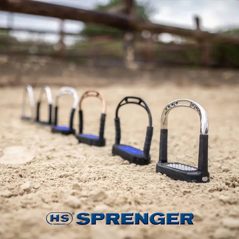 Stijgbeugels Flexcite van het merk Herman Sprenger met het unieke “System-4- technology”. Door het gebruik van deze technology zijn de stijgbeugels beweegbaar in vier richtingen waardoor de enkel, knie, heupgewrichten evenals de kniegewrichten en meniscus worden ontlast.