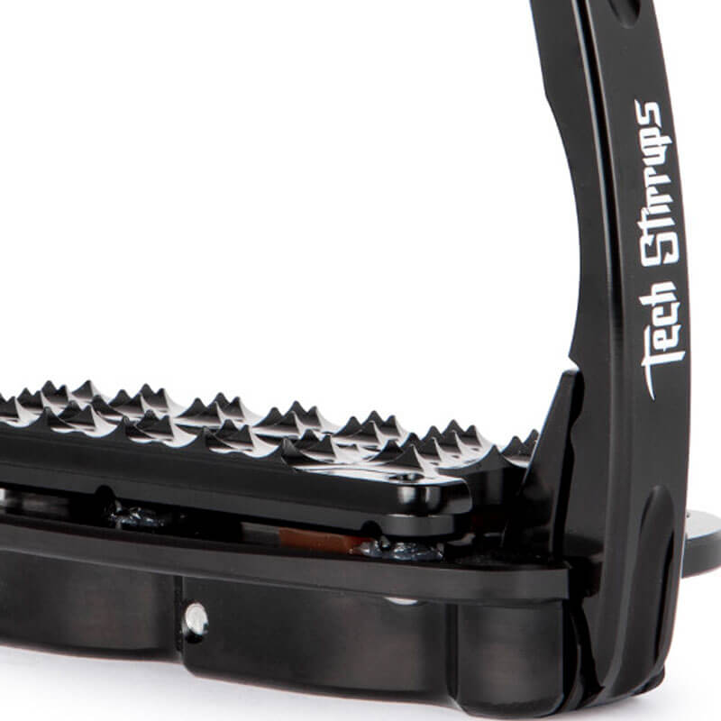 Tech Stirrups Venice Plus Evo Zwart/Zwart. Deze veiligheidsbeugels hebben een schokabsorberend voetgedeelte wat door 4 schokabsorberende inzetstukken wordt gestabiliseerd.